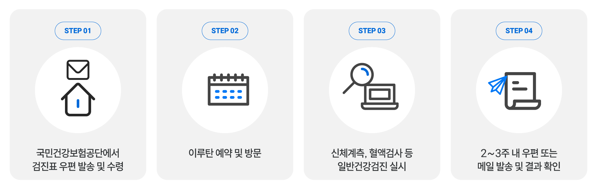 기초검사, 혈액검사, 소변검사, 흉부X선 검사, 구강검진 등